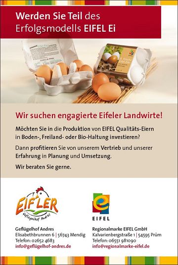 Deshalb sucht unser größter EIFEL Produzent Geflügelhof Andres weitere Lieferanten und Erzeuger, um noch mehr zertifizierte EIFEL Eier an Kunden liefern zu können.