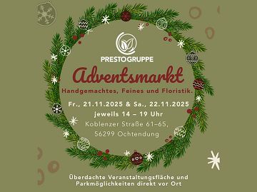 Veranstaltet wird der Markt von der Presto Gruppe, einem familiengeführten Unternehmen mit Sitz in Kobern-Gondorf, Ochtendung und Plaidt. Die Presto Gruppe setzt sich seit über 48 Jahren mit Herz und Verantwortung für regionale Wertschöpfung, nachhaltiges Wirtschaften und die Verbindung von Handwerk, Wirtschaft und Natur ein. Als Hersteller von hochwertigen Erden, Substraten und Recyclinglösungen im Bereich Biomasse bringt die Presto Gruppe ihre nachhaltige Philosophie ganz praktisch auf den Boden. Der Adventsmarkt ist dabei Ausdruck eines größeren Gedankens: Menschen verbinden, Potenziale sichtbar machen und gemeinsam etwas Sinnvolles schaffen.