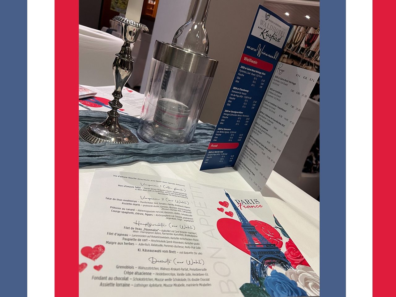Dass das Waldhotel Kurfürst in Kaisersesch schon lange kein Geheim-Tipp mehr ist - besonders bei Bewunderern guten Geschmacks und guter Qualität - ist bekannt. Doch was Christine, Lilli und Denis Arnicot mit ihrem Team bei der diesjährigen 46. Französischen Woche für ihre Gäste wieder geleistet haben, grenzt an Perfektionismus. Deko, Service, Menüzusammenstellung - alles in einem Guss. Französische Gerichte - auch gepaart mit EIFEL Produkten und Zutaten - verwöhnten die Gäste und vermittelten in der EIFEL ein Gefühl des typischen "Savoir-vivre". Warum in die Ferne schweifen, wenn das Gute liegt so nah?! Da fragt man sich auch, welcher Turm nun in Paris steht - der EIFEL-Turm oder der Eiffelturm? Oder ist das alles so gewollt?