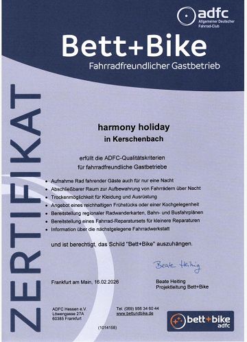 harmony holiday aus Kerschenbach seit Oktober 2025 Mitglied im Netzwerk der Regionalmarke EIFEL mit einer weiteren wichtigen Auszeichnung: Der Allgemeine Deutsche Fahrrad-Club (ADFC) hat den Betrieb offiziell als Bett+Bike-Unterkunft zertifiziert.