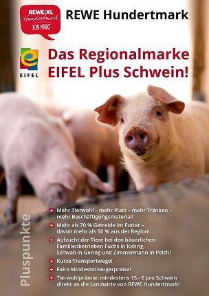 Die Regionalmarke EIFEL entwickelte seit 2020 gemeinsam mit drei Landwirten aus der Osteifel, der Schweinevermarktungsgenossenschaft SVG aus Idenheim, dem Schlachtbetrieb Bayer aus Niederwallmenach, dem Wurstspezialisten Hünten aus Löf und REWE Hundertmark ein neues Konzept zur zukunftsorientierten Vermarktung von regionalen Schweinen (siehe Flyer). Vertragslandwirtschaft, höhere Tierwohlanforderungen, kurze Transportwege, regionales Futter, Ganztiervermarktung, breites Warensortiment, Verkaufsmitarbeiterschulungen, Marketing u.v.m. – all diese Punkte waren bei der Realisierung von grundlegender Bedeutung. Seit Ostern 2021 werden in allen 13 REWE Hundertmark-Filialen bestes Regionalmarke EIFEL Plus Schweinefleisch und leckere EIFEL Wurstwaren angeboten und vermarktet. Die zwei wichtigsten Parteien kommen nun: zum einen das motivierte und gut geschulte Verkaufspersonal hinter den Theken, zum anderen die Verbraucher, die Kunden. Denn was nützt das beste Angebot, wenn die Kunden nicht kaufen? Bei diesem beschrieben Pilotprojekt passt alles, da wirklich alle Produktionsbetriebe über die wichtige Schnittstelle der Verkaufsmitarbeiter mit regional- und qualitätsorientierten Konsumenten optimal harmonieren.