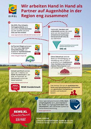 Markus Pfeifer, Geschäftsführer der Regionalmarke EIFEL: „Wir sind sehr stolz und dankbar für das Kooperieren auf Augenhöhe zwischen den drei Landwirten, der Firma Bayer, Fleischwaren Hünten und REWE Hundertmark. Die REWE Hundertmark-Kunden in der Eifel, der Mosel, im Hunsrück und Westerwald nehmen unser Angebot sehr gut an und sind damit auch Teil der Erfolgsstory. Unsere Bitte: macht so weiter. Es lohnt sich!“