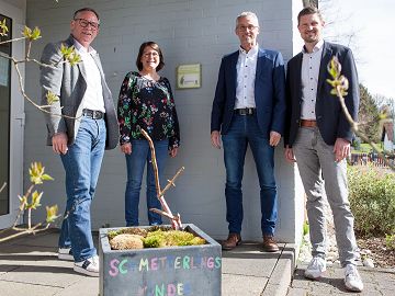 Foto © Stadtwerke Trier: (v. l.) Johann Meyer (LWE), Daniela Mai (Leitung KiTa St. Luzia Ferschweiler), Michael Zepp (LWE), Sascha Wallrich (Katholische KiTa gGmbH Trier)
