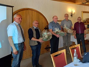 Bild (RME): Verabschiedung verdienter Aufsichtsratsmitglieder durch Günter Heinen (Vorsitzender des Aufsichtsrats, links) und Gerhard Saar (Geschäftsführender Vorstand, rechts) – auch von uns: DANKE für Eure erfolgreiche Arbeit für die regionale Erzeugung!