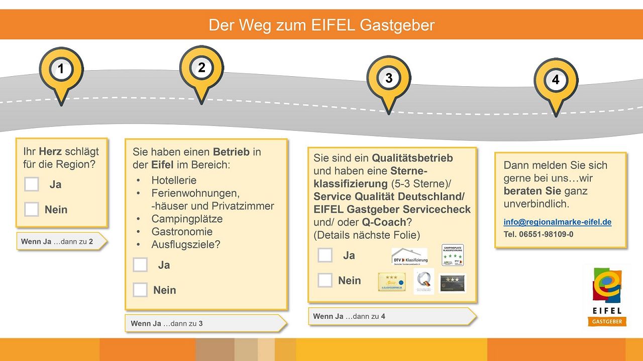 Grundsätzlich können alle Übernachtungs- und Gastronomiebetriebe in der Eifel EIFEL Gastgeber werden. Dazu sollte sich der Betrieb mit der Philosophie der Regionalmarke EIFEL identifizieren und die definierten Qualitätskriterien erfüllen.